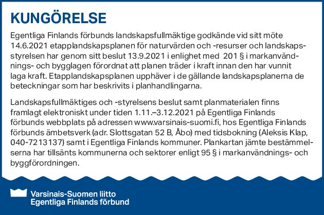 Kungörelse om programmet för deltagande och bedömning i anslutning till etapplandskapsplanen för vattenvård och energi i Egentliga Finland