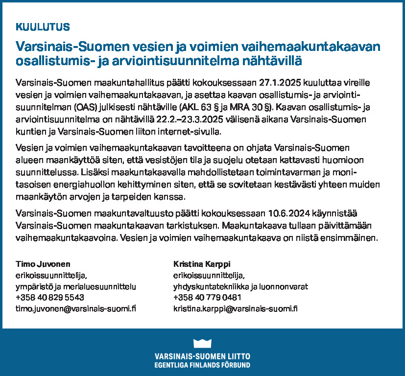 x Vesien ja voimien vaihemaakuntakaavan kuulutus